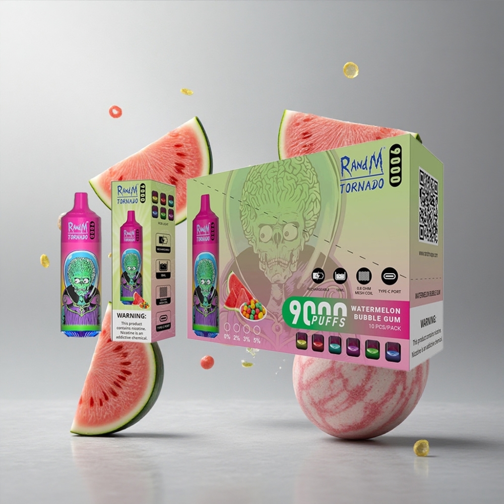 Watermelon Bubble Gum RandM Fumot Tornado 9000 Görögdinnye Bubble Gum 9000 Füst 850 mAh Tölthető Akkumulátor 18 mL E-liquid Mesh Tekercs Elegáns RGB Kijelző 54 Íz Nikotin Opciók: 0%2%3%5% vape Hungary